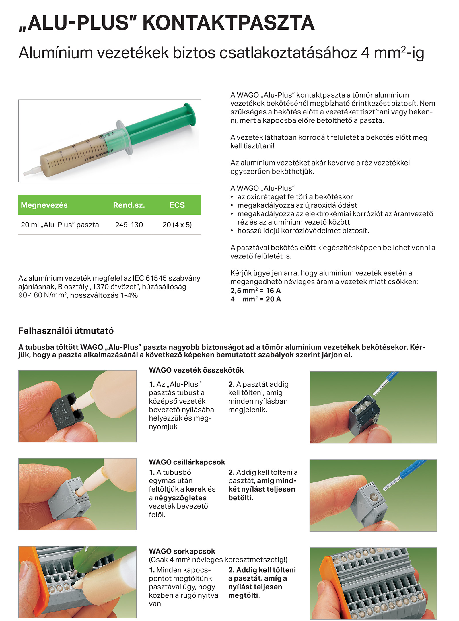 Így néz ki a Wago illetve Weidmüller kötőelem. A fecskendőben alumínium kontaktpaszta van, amivel alumínium kötéseknél tele kell nyomni a kötőelemet mielőtt beletolod a vezetéket. A Wago hivatalos útmutatóját ide kattintva tudod megnézni.